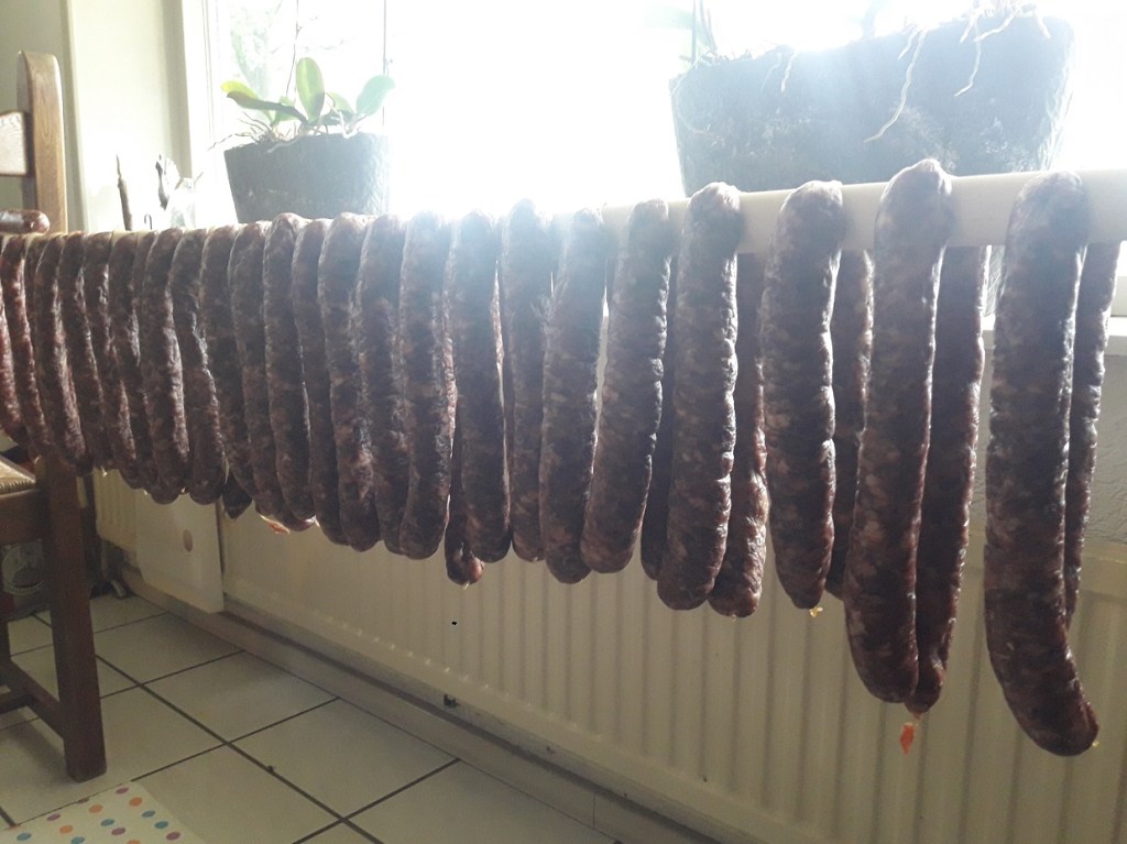 Hangende droge worsten