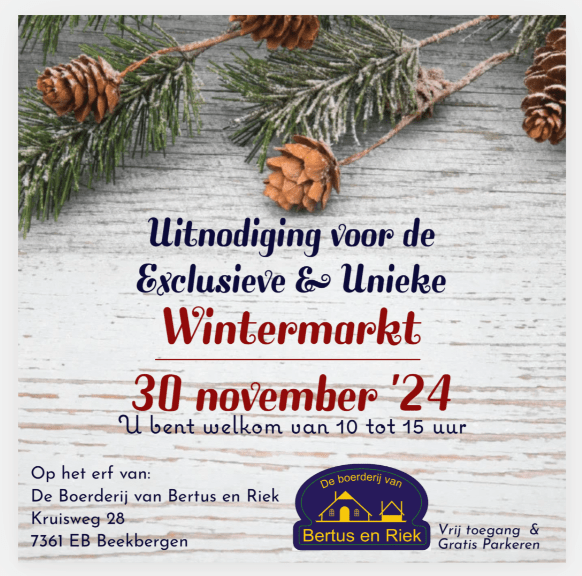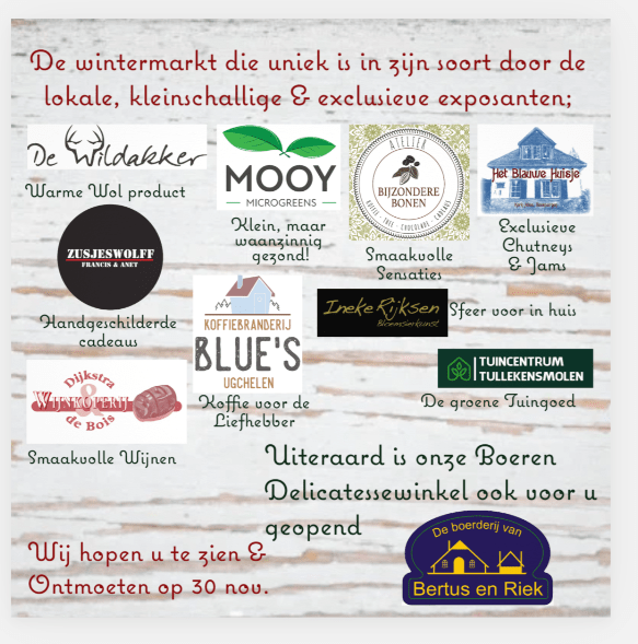 Op Zaterdag 30 november 2024 tussen 10 & 15 uur op het erf van de boerderij, vindt er de wintermarkt weer plaats. Een markt die uniek is in zijn soort door de exclusieve lokale ondernemers die komen.
