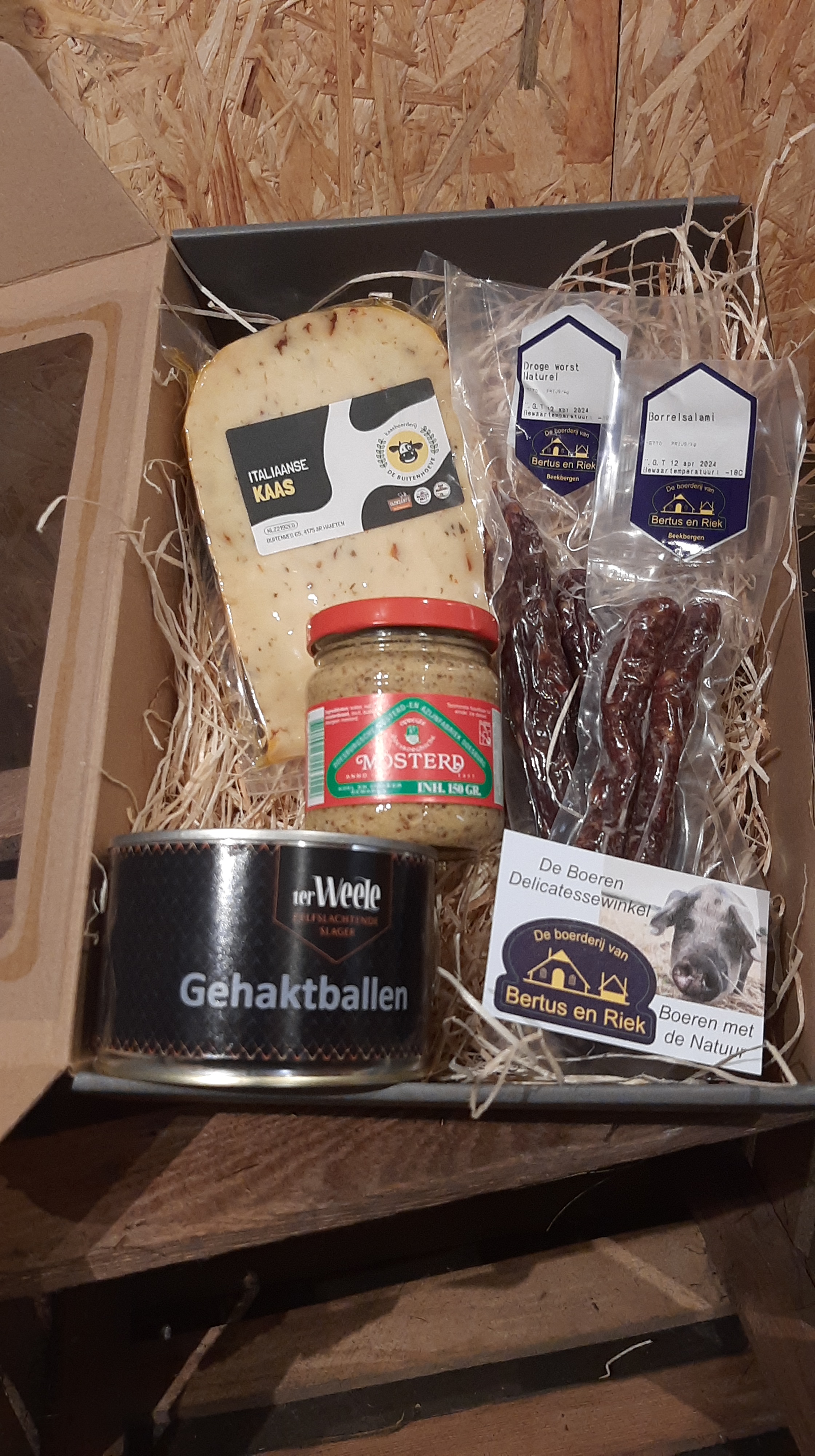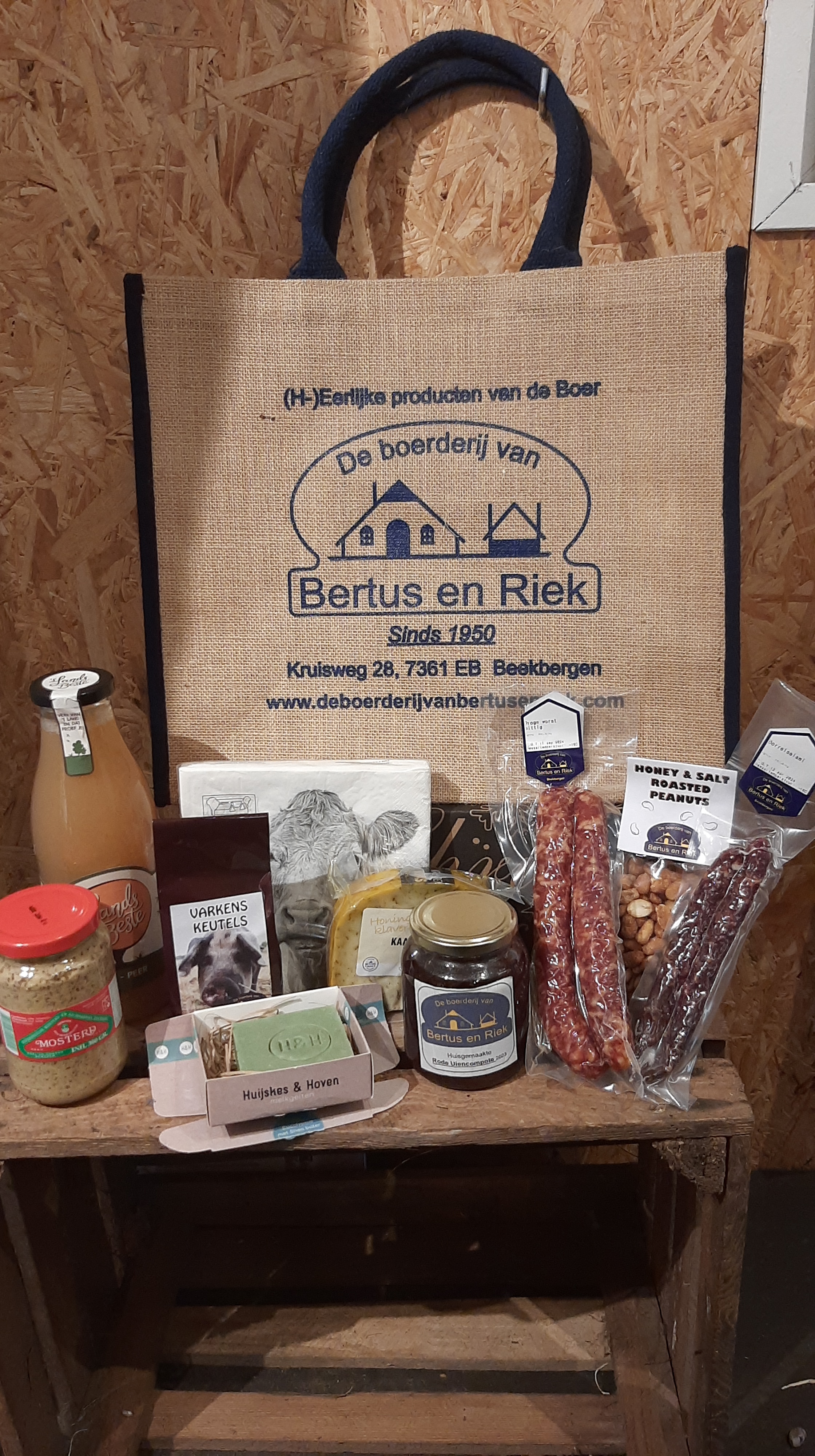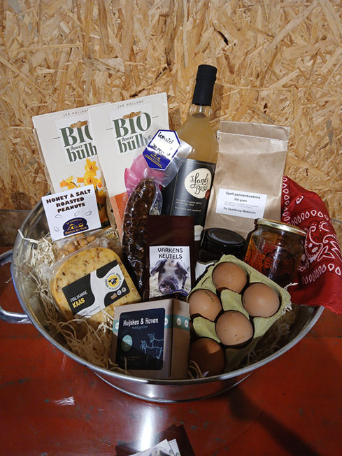 Een uniek pakket gevuld met (h-)eerlijke producten van onze eigen boerderij maar ook met producten van collega-boeren.